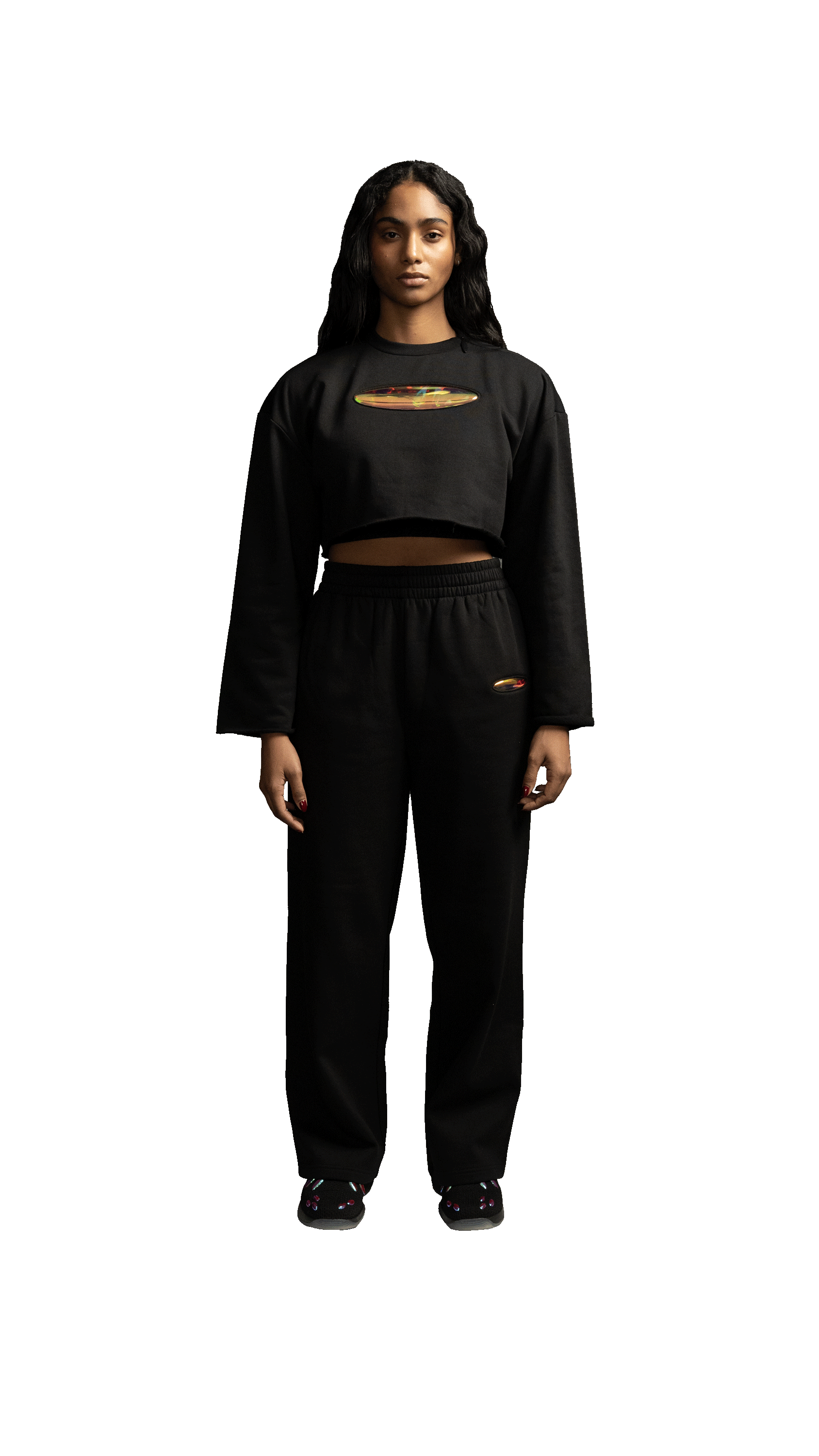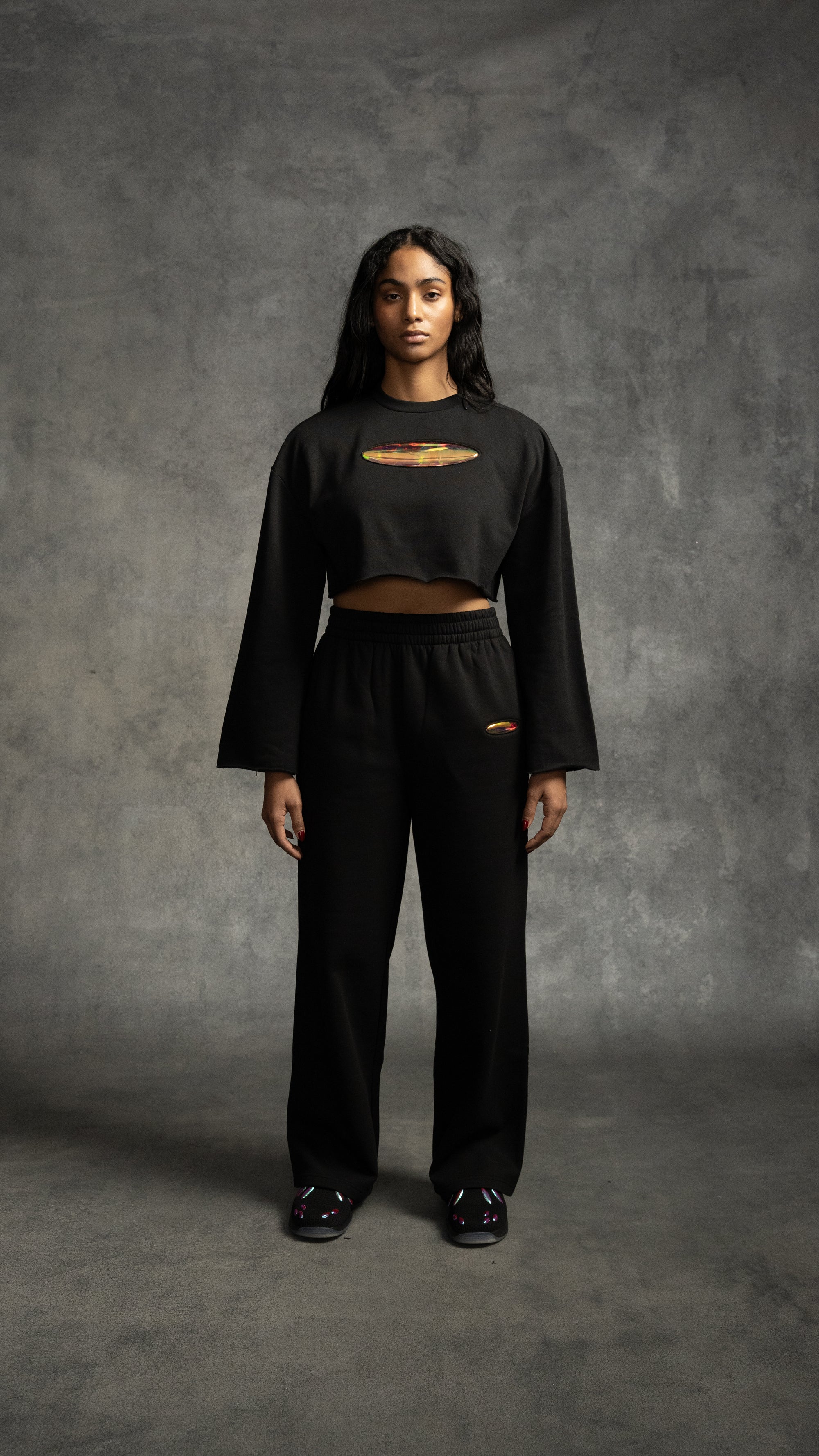 Our cropped mock neck is crafted from soft, mid-weight brushed French terry fabric for ultimate comfort and style. It features a zipper closure at the neckline and wrist-length, slightly flared sleeves. Designed with a boxy fit, dropped shoulders, and a raw edge finish at the sleeves and hem. Features our signature 741 iridescent emblem at the center front for a bold touch.