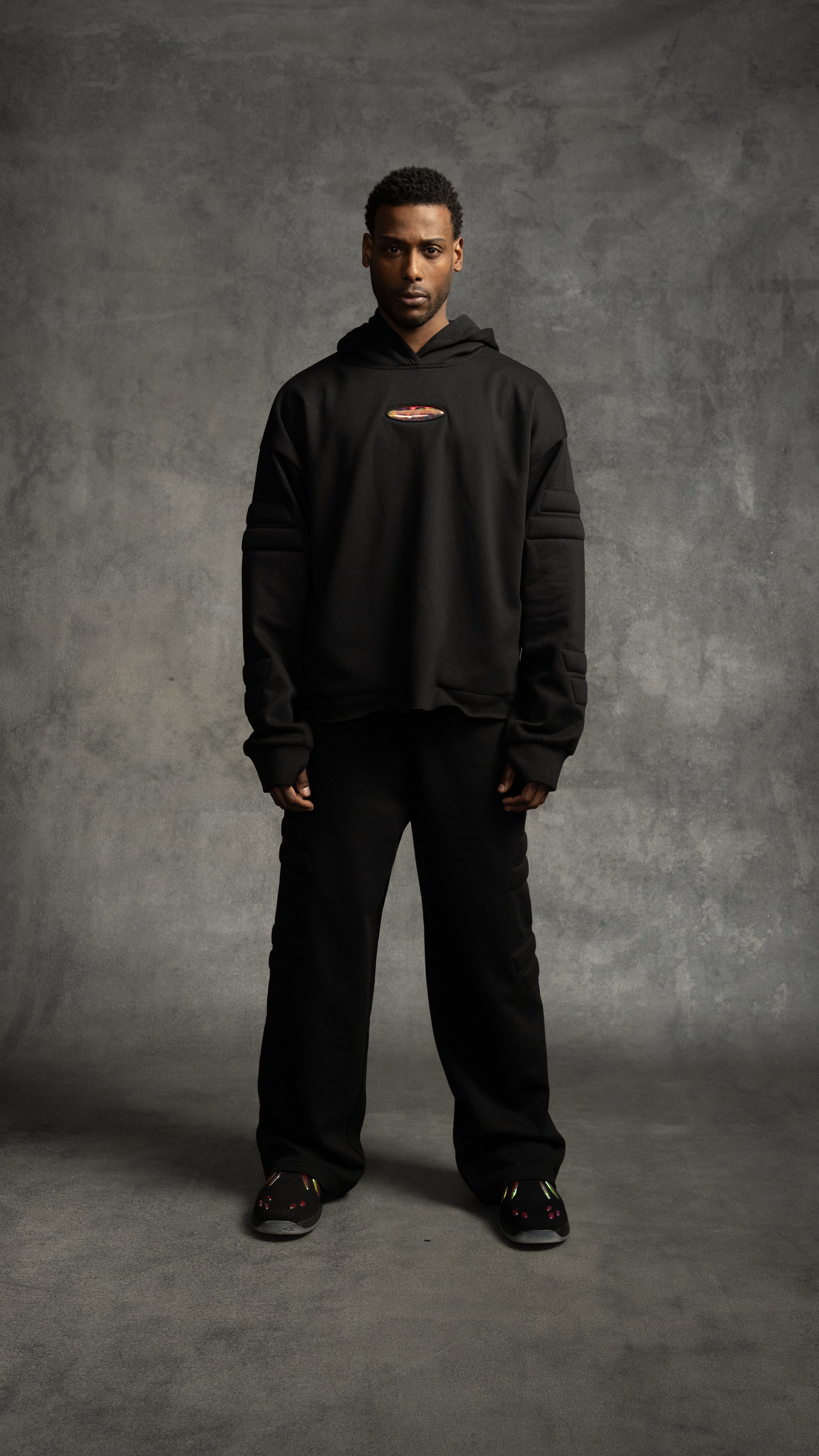 Black loose-fit/slouchy leg sweatpants with a padded detailing on the leg. Crafted from brushed mid-weight French terry fabric. Designed with side seam pockets featuring zipper closures. These sweatpants offer comfort, versatility, and modern style.