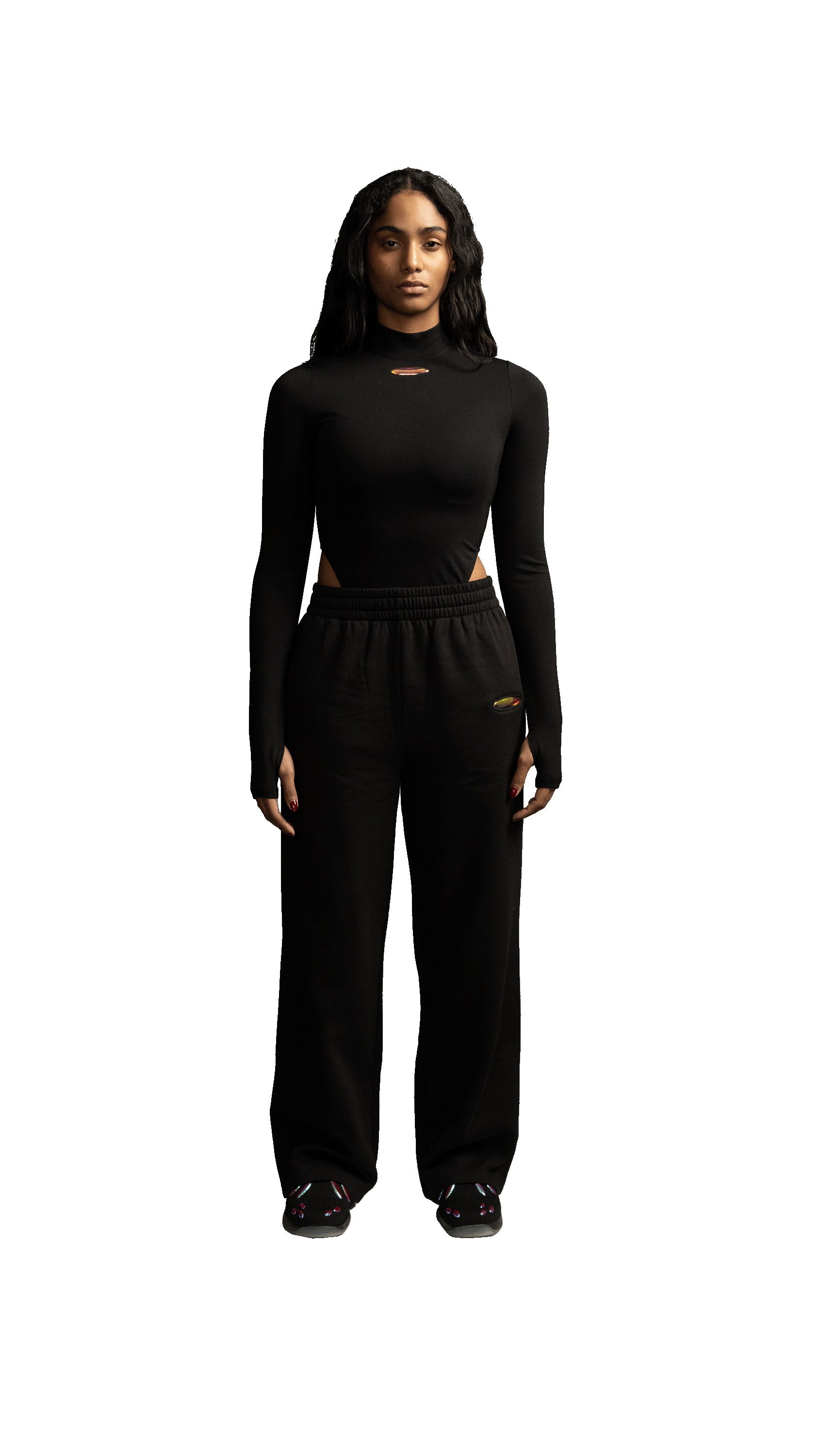 Our long-sleeve bodysuit crafted from our “kinetic” fabric—a durable, shape-defying blended knit with exceptional stretch and recovery. Designed with a high neckline, thumbholes at the sleeves, and a snap closure at the base, it offers a sleek, sculpted fit that flatters and moves with you. The bodysuit briefs are high-cut at the sides for a leg-lengthening effect, adding a modern edge to its design. A chunky GG zipper at the back provides both style and functionality. This fitted silhouette features fabric with a compression-like recovery, ensuring a smooth and supportive fit. Featuring our signature 741 iridescent emblem at the center front.