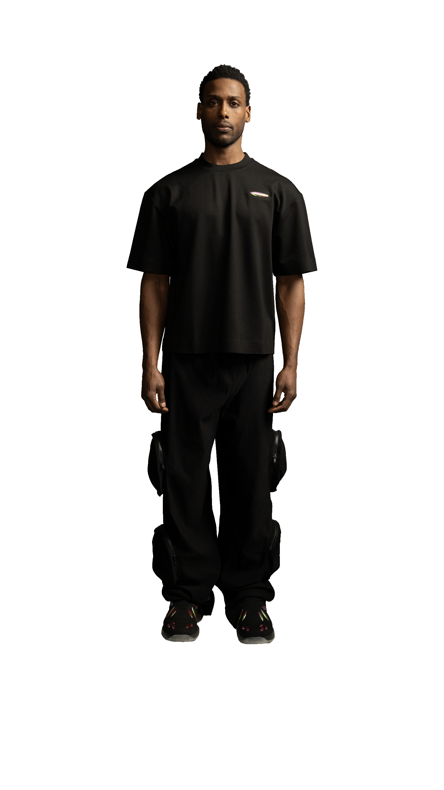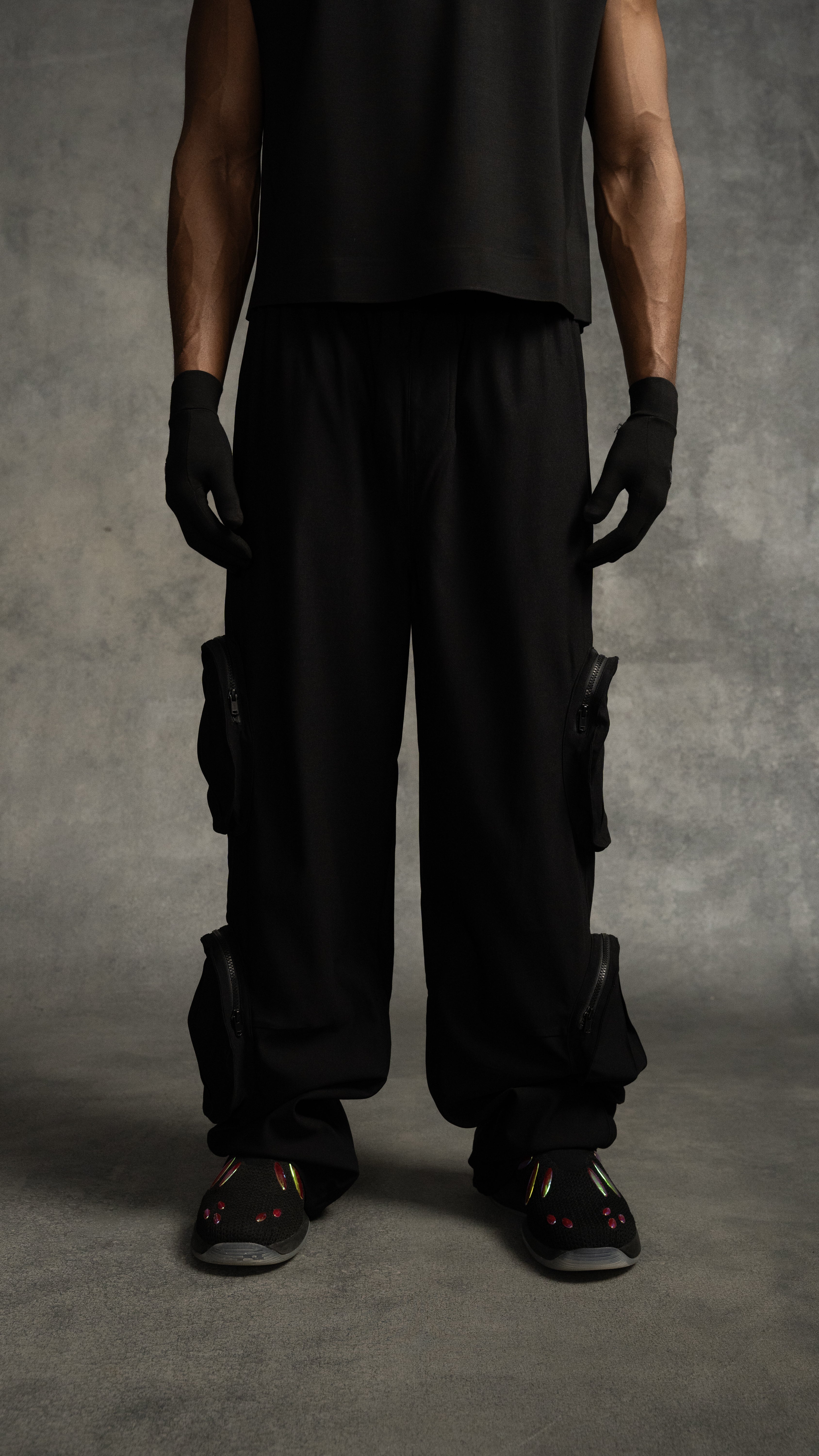 Oversized cargo pants featuring multiple zippered pockets on the thighs for added utility and style. Designed with an elastic waistband for a comfortable and adjustable fit. These pants offer a relaxed fit, perfect for a street-ready, urban look.